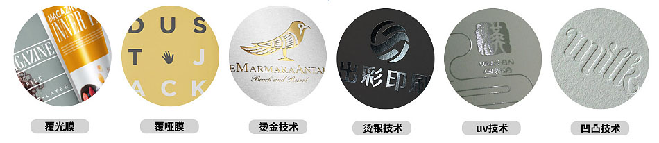 三、燙金、燙銀:燙金一種常見的印刷裝飾工藝,亦作" 燙印 ",其制作原理是將金屬印版加熱,施箔,在印刷品上壓印出金色文字或圖案。燙銀和燙金差不多,只是所選用的材料不同,燙金會呈現金色光澤,而燙銀則會呈現銀色光澤。燙金、燙銀的特點:圖案清晰、美觀,色彩鮮艷奪目,常被用于logo印刷。